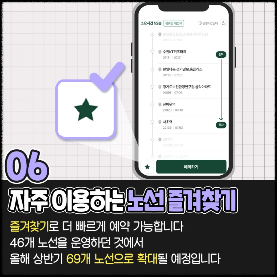 개인적으로 자주 이용하는 노선을 즐겨찾기 해 놓으세요. 즐겨찾기를 통해 더 빠르게 예약 가능합니다. 69개 노선으로 지속적인 확대 해 나가고 있는 상황입니다.