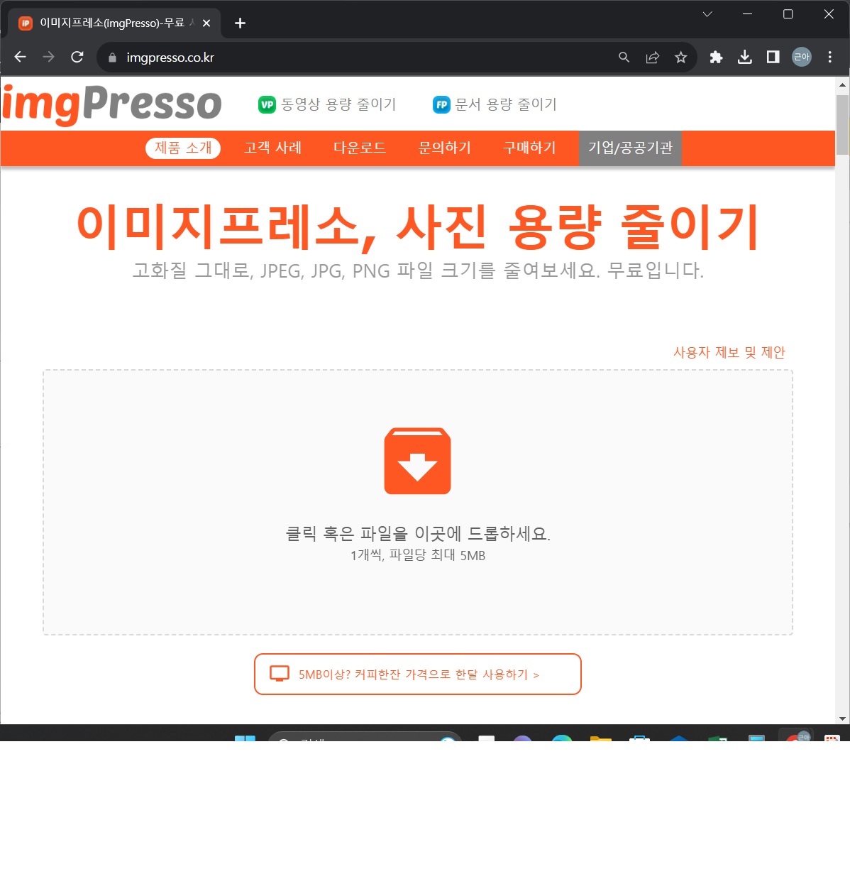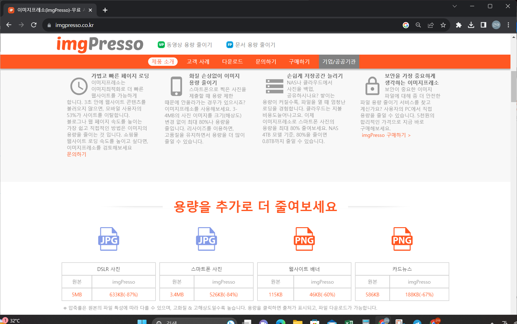 이미지 프레소(https://imgpresso.co.kr/)는 사진 용량 줄이기 이외에도 다양하게 활용할 수 있습니다. 고화질 그대로 jpeg, jpg, png 파일 크기를 줄이는 사이트이며, 무료입니다.