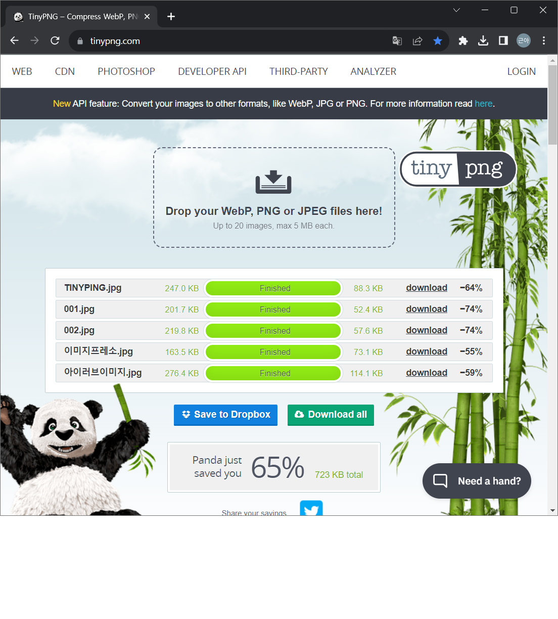 이미지 용량 줄이기를 많이 방문하고 자주 사용하는 사이트로 사용하는데 아주 간편합니다. 외국 사이트(https://tinypng.com/)이며 회원가입 없이 손쉽게 파일 업로드 하고 일괄 다운로드 할 수 있습니다. 하고자 하는 파일을 마우스로 드래그 해서 붙이면 자동으로 변환처리 됩니다. 이미지 해상도 줄이기 최대 20장 가능하며 일괄 다운로드 됩니다. 파일 크기에 따라 다양하게 50%~75%까지 축소할 수 있습니다. 사진 크기 줄이는 사이트에서 더 줄이고 싶다면 2번 이용해서 축소 가능하니 참고하세요.