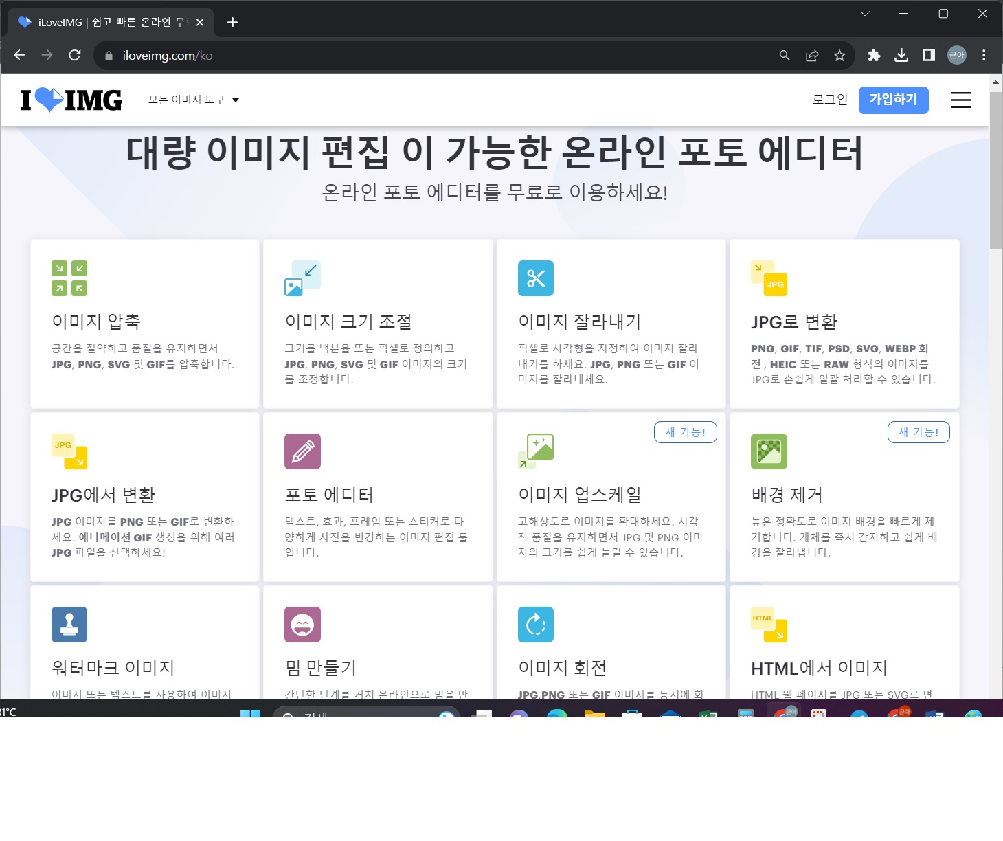대량 이미지 편집이 가능한 온라인 사이트(https://www.iloveimg.com/) 입니다. 이미지 용량 줄이기 포토 에디터를 무료로 이용이 가능하며 이미지 압축, 이미지 크기조절, 이미지 잘라내기, 문서 JPG를 다양한 버전의 PNG, GIF로 변환 가능한 사이트입니다.
